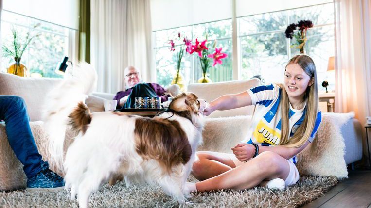 Fleur Harshagen (18) thuis bij haar vader (links buiten beeld) in Lienden, met haar opa op de bank. Al vijftien jaar verplaatst Fleur zich tweemaal per week tussen de huizen van haar co-ouderende vader en moeder. Beeld Katja Poelwijk
