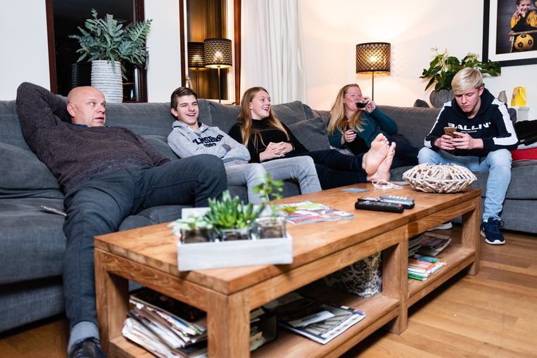 Fleur Harshagen (midden) thuis bij haar moeder in Venlo, met haar stiefvader, broer en stiefbroer met z’n allen op de bank kijkend naar voetbal. Beeld Katja Poelwijk